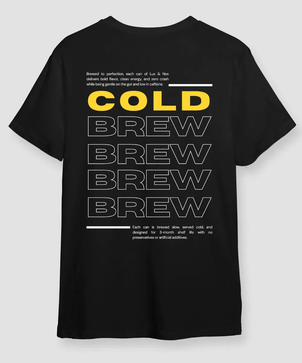 The Design: Minimalist Cold Brew Club mark on the chest, Wide Cold Brew typography design on the back.